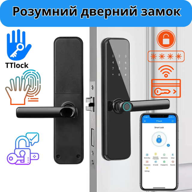 Умный дверной замок кодовый с Wi-Fi, отпечатком пальца и ключ-картой,черный