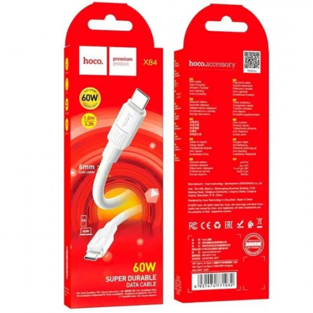 Кабель HOCO X84 Solid Type-C to Type-C 1м charging, ток до 3A для смартфонов 60W Белый