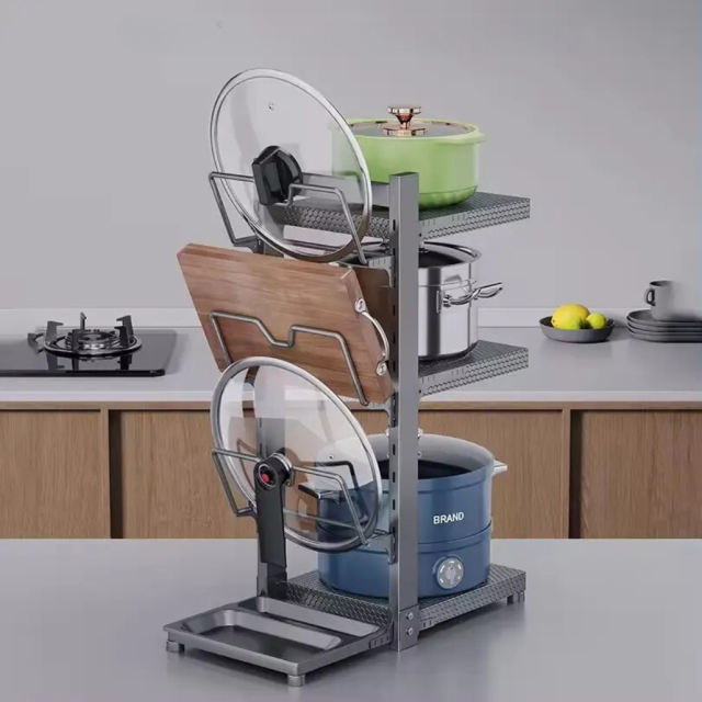 Кухонная полка на 3 уровня с держателями для крышек — это практичное решение для удобного хранения посуды и...
