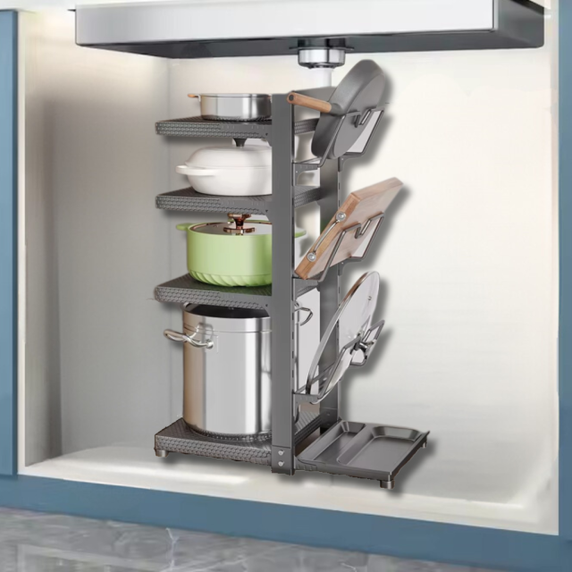 Полка изготовлена из прочной углеродистой стали, что обеспечивает надежность и долговечность. Съемные и регулируемые по высоте полки, а также три держателя для крышек позволяют адаптировать изделие под кастрюли и крышки разных размеров. Встроенный лоток размером 20 х 17 см идеально подходит для хранения столовых приборов, помогая поддерживать порядок на кухне.
