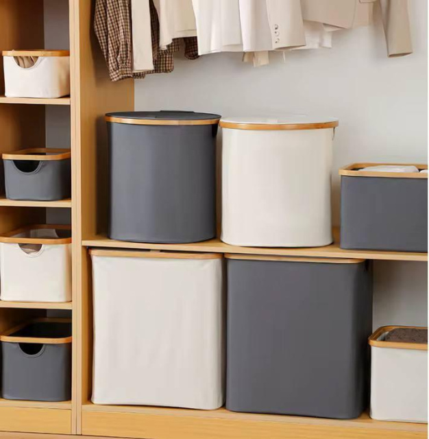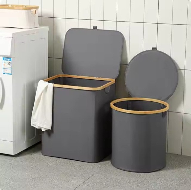 Корзина для белья складная с крышкой и бамбуковыми ручками,серая, Одеса