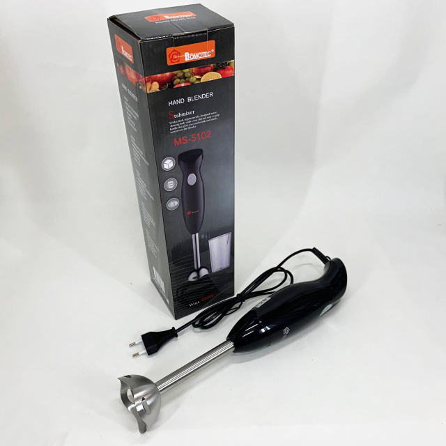 Погружной блендер Domotec MS-5102 400W – ручной блендер высокого качества с ножкой из нержавеющей стали, что обеспечивает легкое и быстрое измельчение ягод, фруктов, супов пюре, коктейлей, детского питания и других ингредиентов. Нарезные ножи долгое время остаются острыми, что увеличивает срок службы прибора. Данная модель подходит для домашнего приготовления суп пюре, который многие обожают. Мамы оценят этот прибор в приготовлении детского питания, ведь мощность этого блендера позволяет сделать это быстро и без лишних усилий. Людям, которые следят за своим питанием так же будет полезно приобрести данный погружной блендер на своей кухне, ведь что может быть лучше, чем свежий смузи с утра.