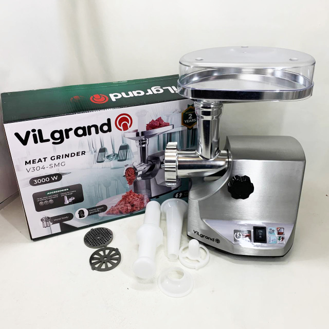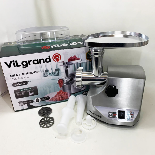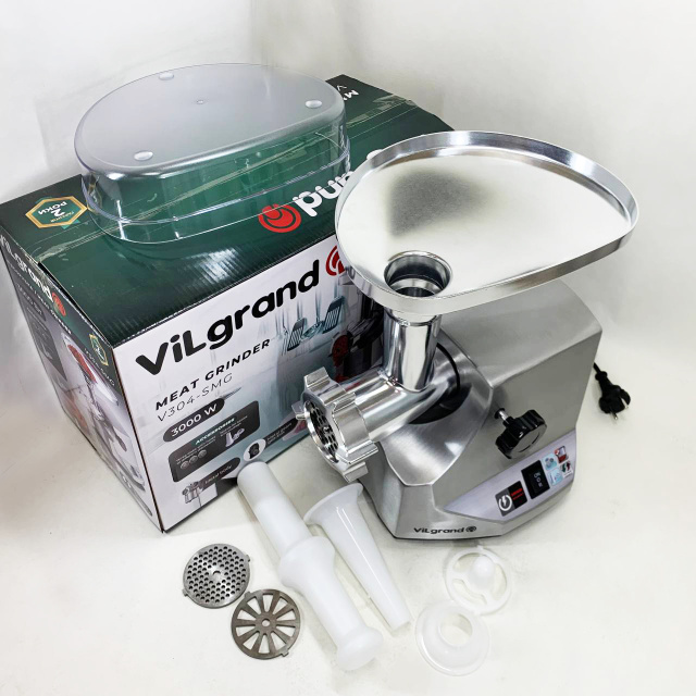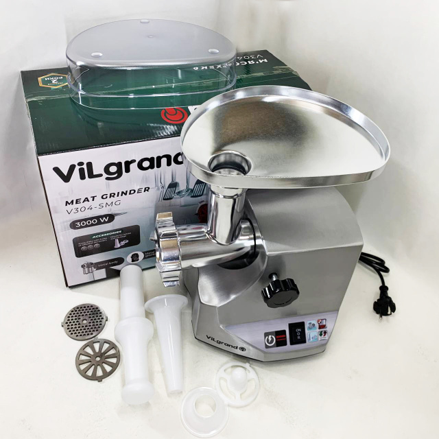 Мясорубка ViLgrand V304-SMG позволяет превращать в фарш любые виды мяса благодаря невероятной мощности в 3000 Вт. Корпус, лоток и крышка лотка данного прибора произведены из нержавеющей стали и прочного пластика, отличающихся высокой износостойкостью.