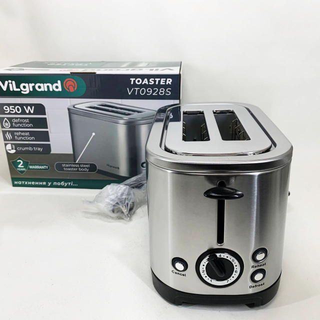 Тостер электрический VT0928S из нержавеющей стали имеет два отсека для хлеба и семь уровней поджарки от нежного золотистого оттенка хлебцев до хрустящей коричневой корочки.
