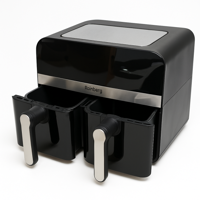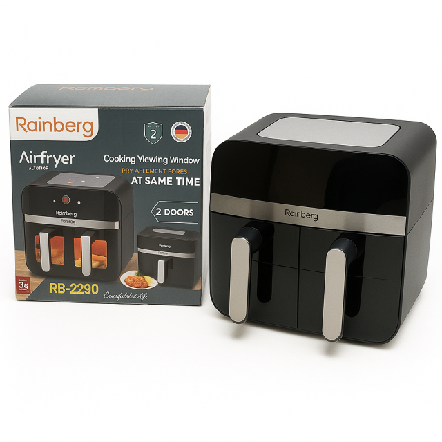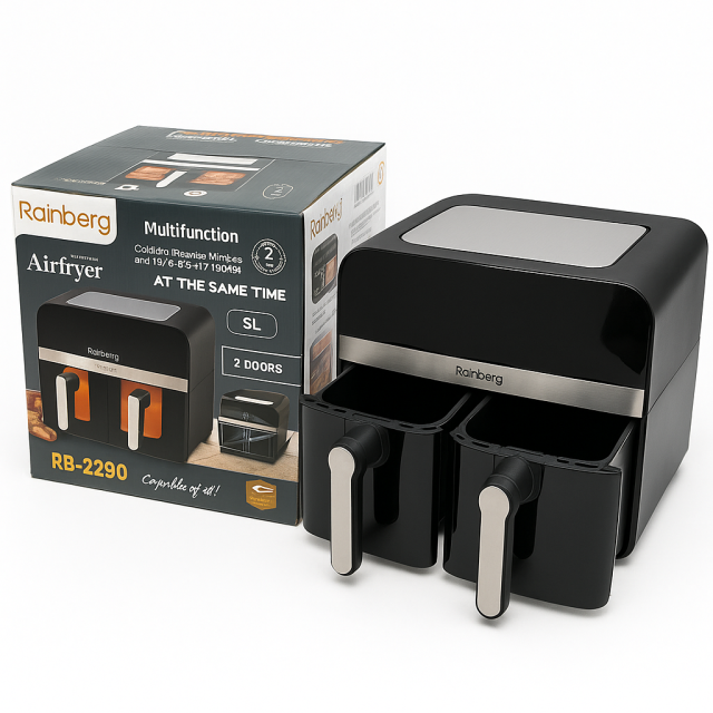 Аэрофритюрница Rainberg RB-2290 привнесет на вашу кухню умное приготовление пищи благодаря современному элегантному дизайну и передовой технологии циркуляции воздуха. Эта фритюрница позволяет готовить здоровую пищу с минимальным количеством масла благодаря регулируемому температурному режиму и системе быстрой циркуляции горячего воздуха. Благодаря вместимости 13 л (6.5л + 6.5л) и антипригарному политетрафторэтиленовому покрытию фритюрница Rainberg RB-2290 позволяет легко приготовить все - от хрустящего картофеля фри до запеченной курицы. Предназначенная для домашнего использования, она выполнена в классическом черном цвете и оснащена мощной 4200-ваттной мощностью для быстрого приготовления пищи.Аэрофритюрница изготовлена из прочного пластика, а ее детали легко моются. Кроме того, она идеально подходит для пользователей со всего мира