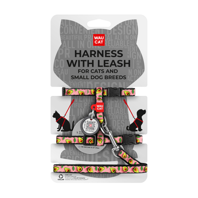 Шлея з повідцем для котів та дрібних порід собак WAUDOG Nylon з QR паспортом, малюнок «Авокадо на рожевому», пластиковий фастекс, XS, Ш 10 мм, В..., Одеса