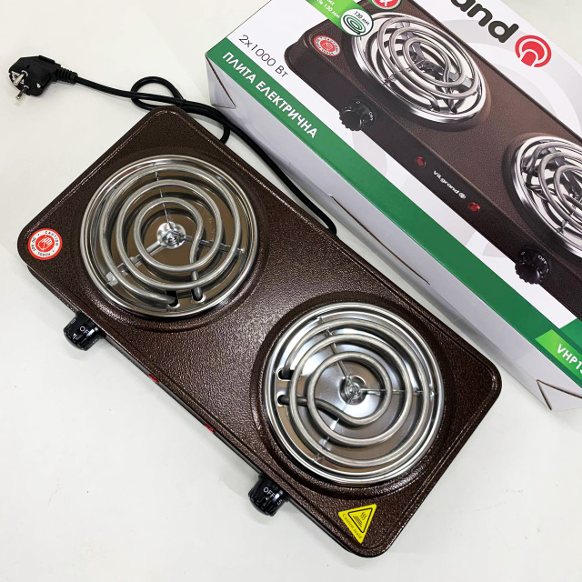 Электроплита оснащена двумя конфорками мощностью 1000 Вт каждая и управляется поворотным регулятором мощности.