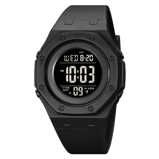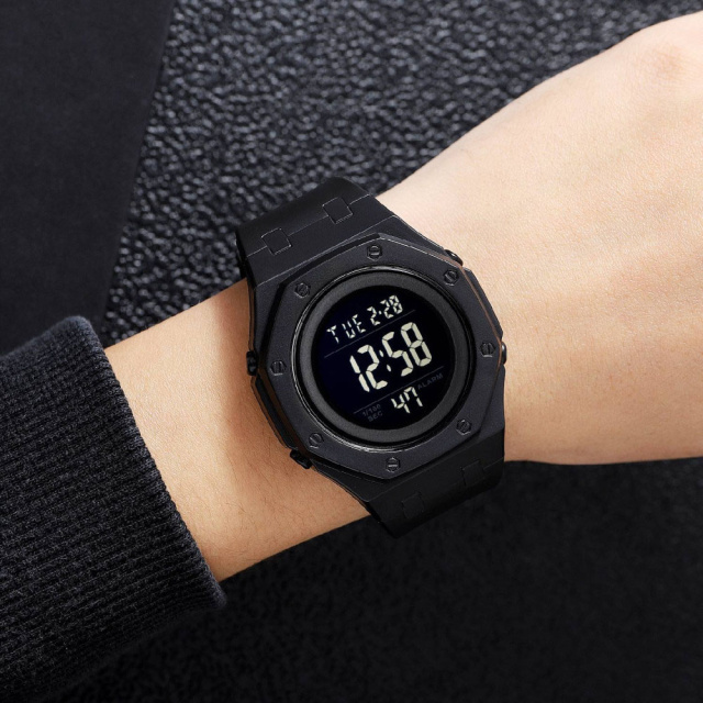 SKMEI 2048BKBK – это воплощение лаконичного дизайна в современном цифровом исполнении. Полностью черный корпус в сочетании с матовым ремешком создает сдержанный и одновременно агрессивный образ, идеально подходящий как для городского стиля, так и для активного образа жизни. Дисплей с инверсной подсветкой придает часам технологичность и подчеркивает их характер.