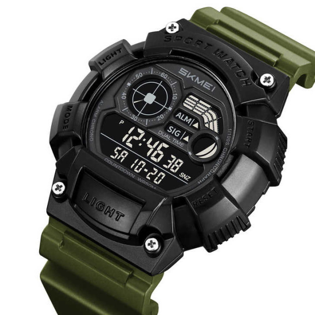 SKMEI 2403AG — это надежные цифровые часы в военно-спортивном стиле, созданные для активных людей, нуждающихся в функциональном и выносливом аксессуаре. Модель оснащена широким набором возможностей, среди которых второе время, будильник, таймер, секундомер, а также подсветка для комфортного использования в темноте.