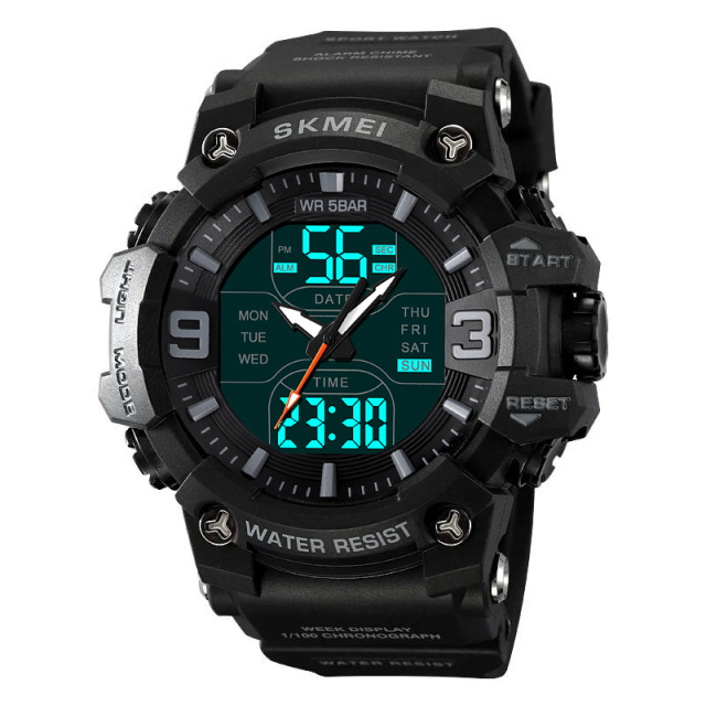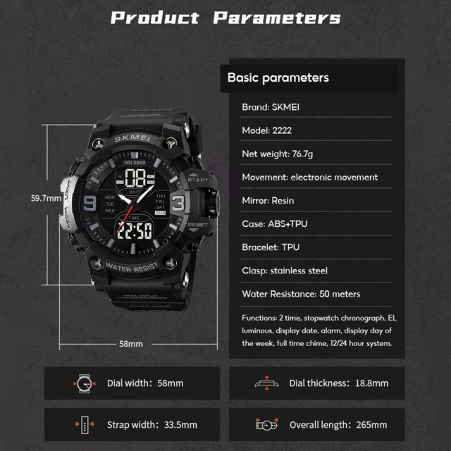Модель оснащена всем необходимым для повседневного применения – двойное время, дата, день недели, секундомер, будильник, подсветка и формат 12/24 час. Водозащита 5 ATM позволяет не снимать часы во время дождя, мытья рук или даже плавания. SKMEI 2222BK станет вашим надежным спутником в любых условиях – от спортзала до путешествий и приключений на природе.