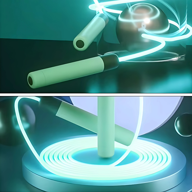 Скакалка светящаяся светодиодная 2.8 м для детей и взрослых с LED-подсветкой для занятий спортом, зелёная. Прозрачный шнур с активацией подсветки наполняется зелёно-синим светом, создавая эффектное свечение во время прыжков. Работает от 4 батареек типа АА (по 2 в каждую ручку), обеспечивая яркость и продолжительность работы. Эргономичные рифлёные ручки обеспечивают надёжный хват, предотвращая скольжение во время тренировок. Длина шнура регулируется, позволяя настроить скакалку под любой рост.
