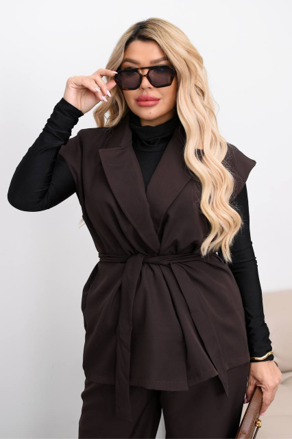 Елегантний костюм-двійка з костюмної тканини - вибір для жінок, які цінують комфорт та стиль. Прямі штани візуально витягають силует, а подовжений жилет з англійським коміром надає образу витонченості. Кольорах- Чорний, шоколадний та глибокий синій.