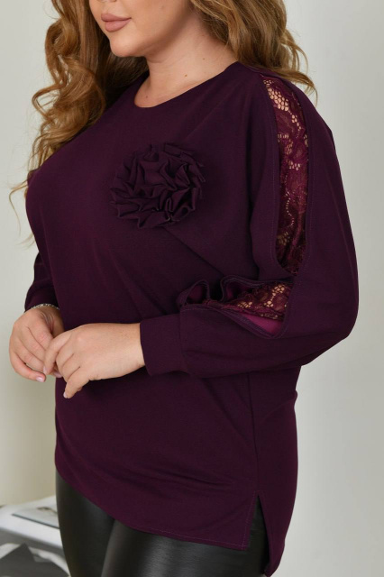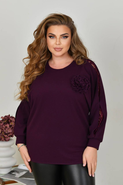 Стильна та вишукана туніка вільного прямого силуету із трикотажу креп-стретч (розтяжність середня), виріз горловини круглий, рукав 3/4. Низ асиметричний, з невеликими розрізами. Туніку декоровано трояндою із основної тканини (за потреби можна зняти). Кишень та застібок немає.