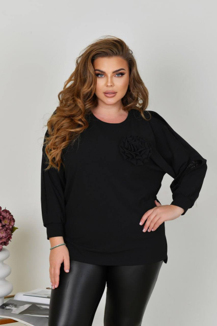 Стильна та вишукана туніка вільного прямого силуету із трикотажу креп-стретч (розтяжність середня), виріз горловини круглий, рукав 3/4. Низ асиметричний, з невеликими розрізами. Туніку декоровано трояндою із основної тканини (за потреби можна зняти). Кишень та застібок немає.