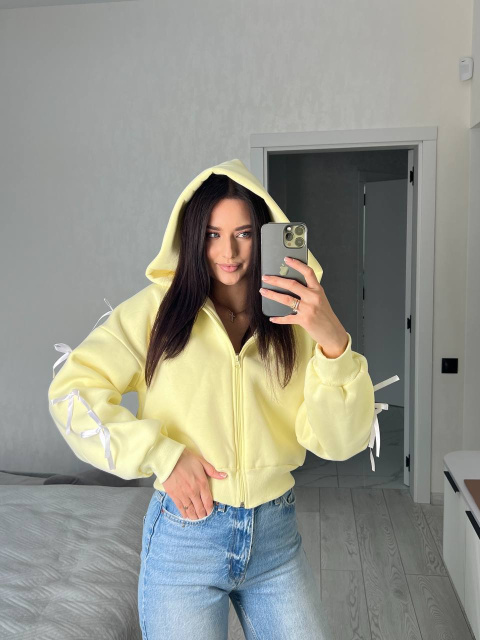 Модель на замку з капюшоном, декорована бантиками вздовж рукавів — деталь, що додає оригінальності та жіночності. Приємна на дотик тринитка забезпечує тепло й комфорт у будь-яку пору року.