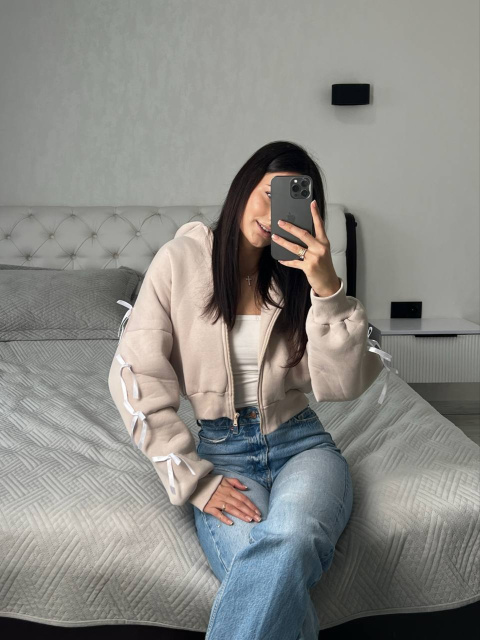 Модель на замку з капюшоном, декорована бантиками вздовж рукавів — деталь, що додає оригінальності та жіночності. Приємна на дотик тринитка забезпечує тепло й комфорт у будь-яку пору року.