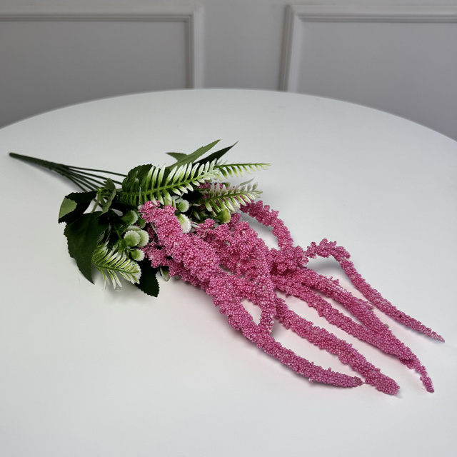 Искусственная ветвь амаранта в цвете фуксия создает яркий декоративный акцент благодаря насыщенному оттенку и эффектным поникающим соцветиям. Мелкозернистая текстура цветочных элементов выглядит объемно и живо, а сочетание с зелеными листьями добавляет композиции природной гармонии и глубины.