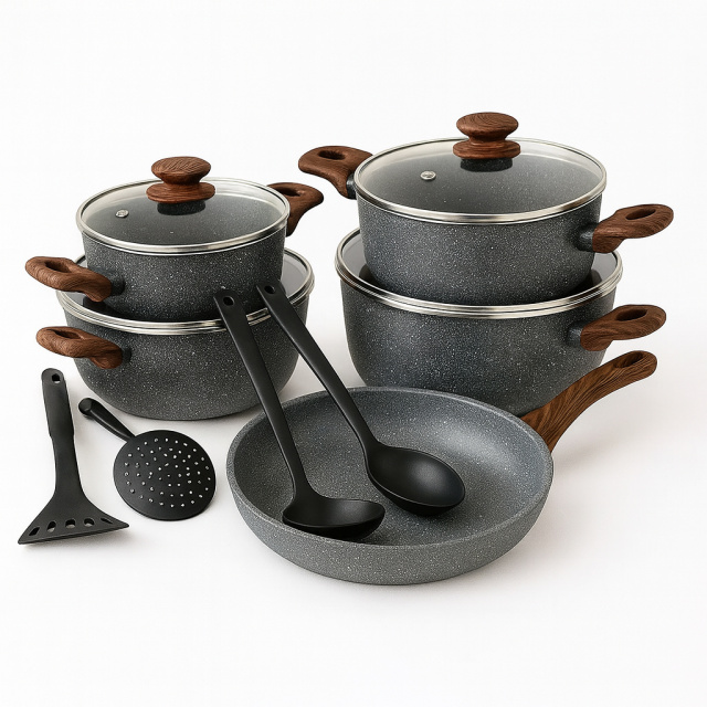 Набор кастрюль Rainberg RB-2301 представляет собой идеальный выбор для тех, кто ищет надежную, функциональную и стильную посуду для своей кухни. Этот набор состоит из 13 предметов, включающих 4 размера кастрюль и крышек, сковороду и нейлоновые приборы, удовлетворяя все ваши потребности при готовке.