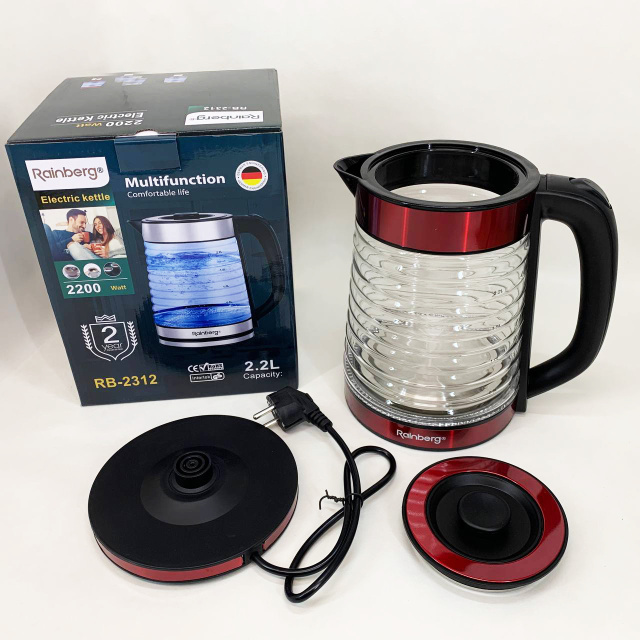 Электрочайник Rainberg RB-2312 стеклянный дисковый чайник 2.2л 2200Вт Red, Одесса