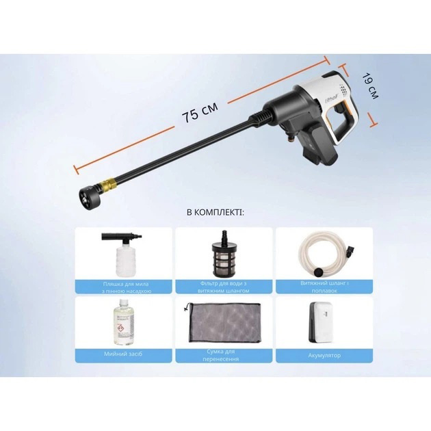 УМБ Litheli Power Bank 20000 mAч, Распылительная трубка, Адаптер для насадки, Многофункциональная насадка 5-в-1, Фильтр для шланга, Бутылка для мыла с пенной насадкой, Всасывающий шланг (6 м), Моющее средство/ Моющее средство>