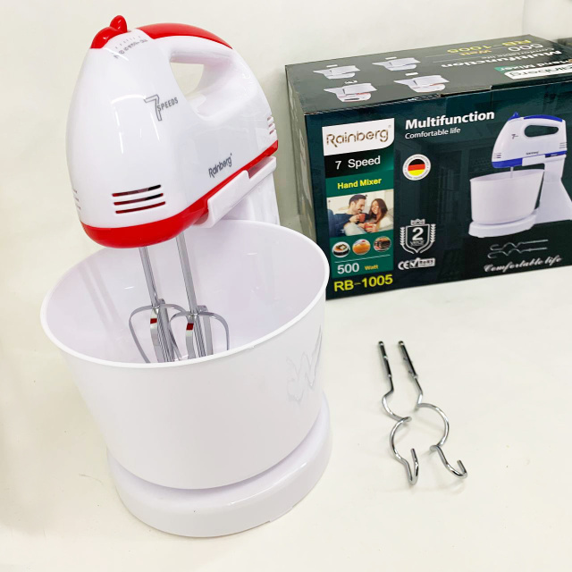 Миксер Rainberg великолепный кухонный помощник. Он оснащен насадками для взбивания и перемешивания, и отлично справится с приготовлением теста, кремов и коктейлей, соусов и многого другого. Миксер Rainberg можно использовать в ручном режиме и на стационарной подставке. Установка 7 скоростей работы, позволяет выбирать максимально эффективный для поставленной задачи режим. Корпус миксера изготовлен из пластика, а насадки из нержавеющей стали. Миксер Rainbergоптимальное соотношение функциональности и цены.