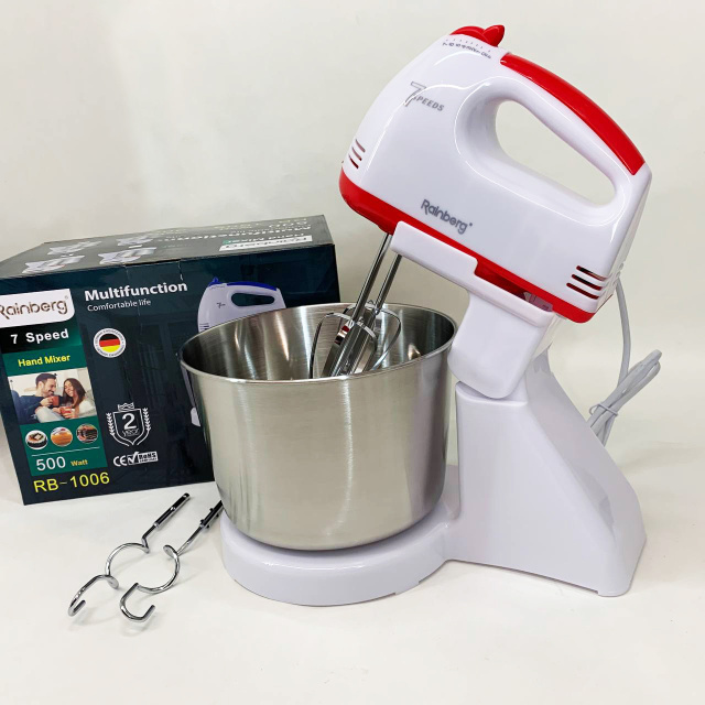 Благодаря 7 скоростным режимам и высокой мощности миксера Rainberg RB1006 , которая составляет —500W, Вы с легкостью воссоздадите все виды теста, от жидкого, воздушного, до плотного и крепкого теста. А два венчика для взбивания позволят быстро и качественно взбить нужный Вам продукт, будь то яичные белки либо же воздушное суфле. Миксер Rainberg RB1006 — прибор очень удобный и легкий в использовании и очистке.