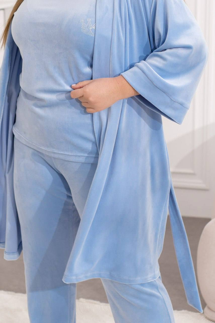 Стильний та комфортний костюм-трійка батал. В комплекті халат з кишенями по сторонам, декорований візерунком зі страз на спині, застібок немає, в комплекті пасок, для нього - дві шлівки по сторонам. Футболка без застібок та кишень, на грудях - візерунок зі страз. Горловина півкругла, рукава з невеликими м'якими манжетами. Брюки з високою талією, вшитою до пояса резинкою та кишенями в швах.
