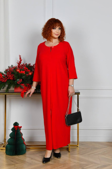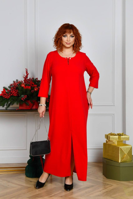 Довга сукня вільного прямого силуету з оригінальним вирізом горловини, яка декорована прикрасою з перлинками. Рукав прямий, трохи вкорочений. Попереду внизу оброблено розріз, що додає образу витонченості та стрункості. Застібок, кишень немає.