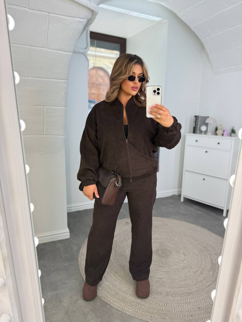 Костюм вельвет бомбер + штани. Бомбер на блискавці, знизу на резинці, довгий спущений рукав на резинці, із кишенями. Штани прямого крою високої посадки, із кишенями,талія на резинці.