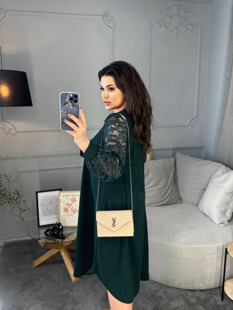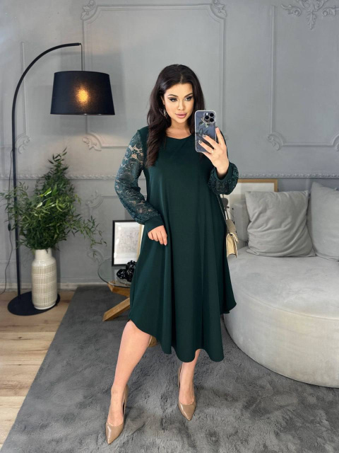 Силует сукні у вигляді трапеції, завдяки чому чудово маскує будь-які недоліки фігури та підкреслює її переваги. Виріз горловини круглий. Рукави на манжетах, виконані із гарного гіпюру в тон основної тканини. Низ сукні асиметричний. Застібок кишень немає.