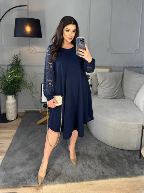 Силует сукні у вигляді трапеції, завдяки чому чудово маскує будь-які недоліки фігури та підкреслює її переваги. Виріз горловини круглий. Рукави на манжетах, виконані із гарного гіпюру в тон основної тканини. Низ сукні асиметричний. Застібок кишень немає.