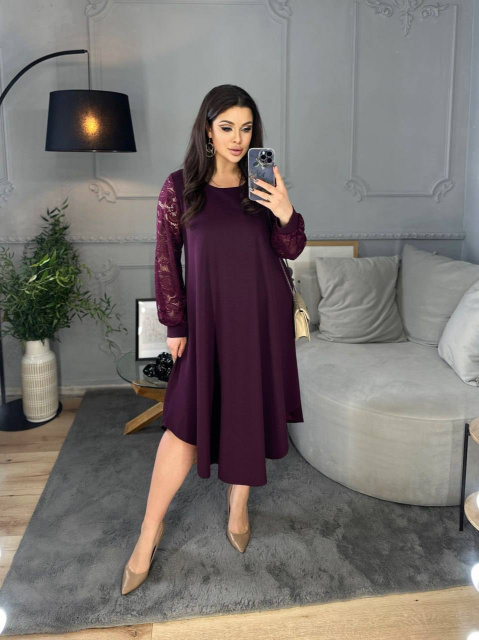 Силует сукні у вигляді трапеції, завдяки чому чудово маскує будь-які недоліки фігури та підкреслює її переваги. Виріз горловини круглий. Рукави на манжетах, виконані із гарного гіпюру в тон основної тканини. Низ сукні асиметричний. Застібок кишень немає.