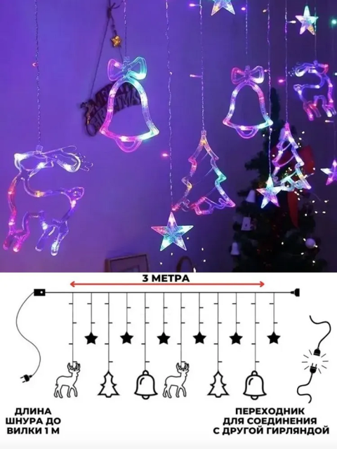 Гирлянда светодиодная штора занавес Рождественские фигурки 3 м "Олень, ёлка, колокольчик" питание от сети 220В