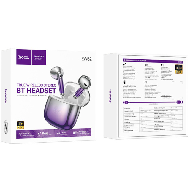 Навушники Hoco EW62 Glitter оснащені передовою версією Bluetooth 5.3, що забезпечує стабільне з'єднання на відстані до 10 метрів. Кожен навушник має акумулятор ємністю 30 мА·г, а кейс — 300 мА·г, що дозволяє насолоджуватися музикою до 4 годин без підзарядки. Час розмови становить до 3,5 годин, а повна зарядка займає близько 2 годин через роз'єм Type-C. Сенсорне управління робить використання навушників інтуїтивно зрозумілим та зручним.