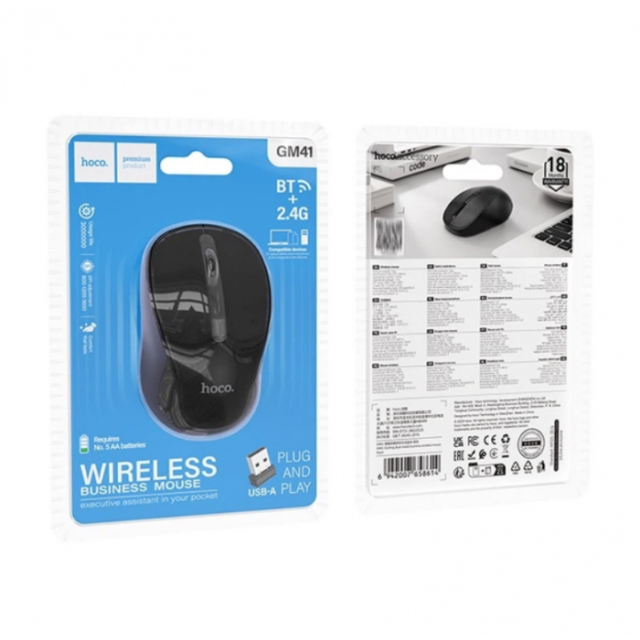 Беспроводная мышка HOCO Exciting dual-mode business wireless mouse GM41 – это универсальный инструмент для офисной работы и ежедневного использования. Модель совмещает сразу два способа подключения: технологию 2.4G через USB-приемник и Bluetooth 3.0/5.2, что делает ее совместимой с ноутбуками, ПК, планшетами и смартфонами. Благодаря использованию чипа MX8650 и контроллера YiCHiP мышь обеспечивает плавное перемещение курсора без задержек и рывков, что особенно важно для комфортной работы в течение дня.Мышь поддерживает три режима чувствительности – 800, 1200 и 1600 DPI, что позволяет быстро настроить точность под конкретные задачи: от работы с документами до веб-серфинга или легкого редактирования изображений. Корпус изготовлен из прочного ABS-пластика, имеет удобную форму и небольшой вес, что делает устройство удобным для длительного использования. У модели нет подсветки, что делает ее идеальным решением для офиса и рабочих сред, где ценится строгий дизайн и отсутствие лишних эффектов.Достоинства:Поддержка двух режимов подключения: 2.4G и Bluetooth 3.0/5.2Плавная и стабильная работа благодаря чипу MX8650Три режима DPI: 800, 1200, 1600Легкий и эргономичный дизайнСовместимость с ноутбуками, ПК, планшетами и смартфонамиПрочный ABS корпусОтсутствие подсветки для офисного стиляСферы использования:Офисная работаДомашнее использованиеРабота за ноутбуком в поездкахБазовая работа с графикойОсновные характеристики:Материал: ABSРазмер: 99×57×38 ммЧип: MX8650Контроллер: YiCHiPТип подключения: 2.4G/Bluetooth 3.0+5.2DPI: 800/1200/1600Количество кнопок: 4Иллюминация: отсутствуетЦвет: черныйКомплектация:Михаил HOCO GM41USB-приемник 2.4GИнструкцияУпаковка производителя