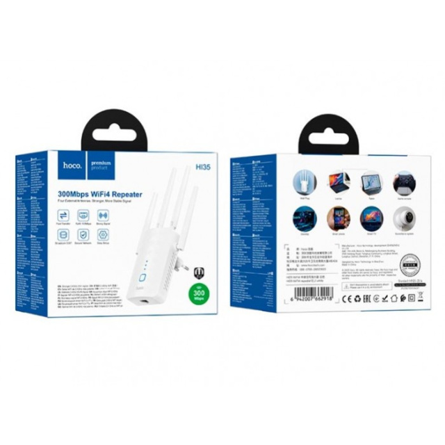 Hoco HI35 – это практичное решение для улучшения Wi-Fi сигнала в квартирах, домах, офисах или кафе. Модель совмещает высокую скорость, стабильность соединения и простоту настройки. Репитер поддерживает современные протоколы безопасности, совместимый с большинством маршрутизаторов и привлекателен своим дизайном.