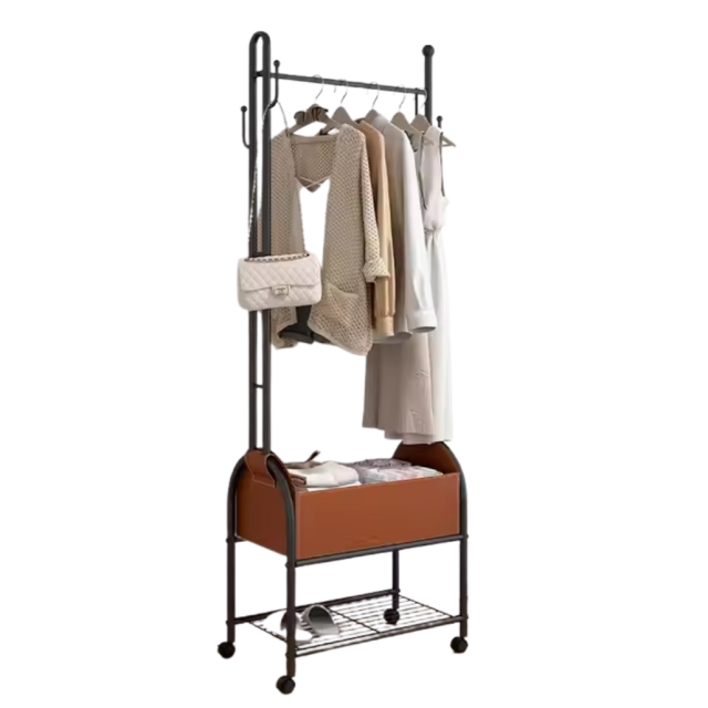 Этот стеллаж-вешалка для одежды — идеальное решение для тех, кто ценит порядок и организацию в своем пространстве. Он выполнен из прочного металла и оснащен полкой для обуви, что позволяет хранить не только одежду, но и аксессуары. Вешалка для шляп и крючки для различных мелочей обеспечат дополнительное место для хранения, а перекладина для тремпелей позволяет удобно повесить костюмы, пальто или рубашки. Ящик из искусственной кожи на липучках поможет аккуратно разместить другие вещи, не создавая беспорядка.