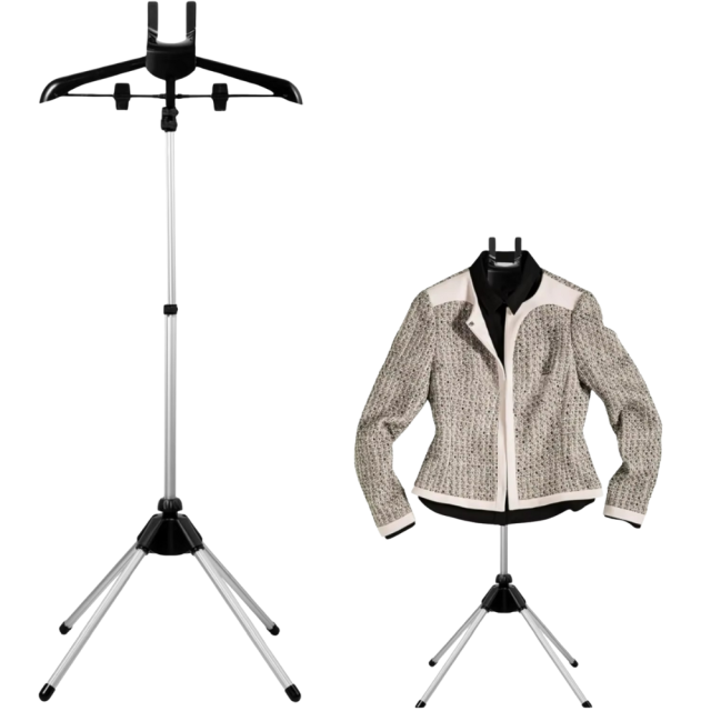 Стойка оснащена телескопической штангой с регулируемой высотой от 85 до 160 см, что позволяет настроить её под рост и рабочие условия. Прочная алюминиевая основа с пластиковыми элементами гарантирует долговечность и устойчивость даже при интенсивном использовании. Выдвижные держатели и удобные прищепки позволяют фиксировать одежду разных типов — от рубашек до верхней одежды.