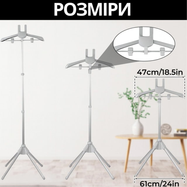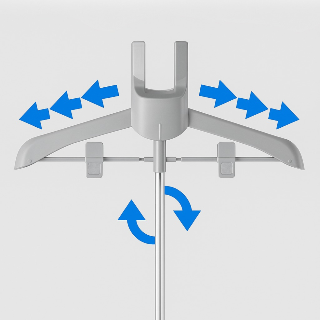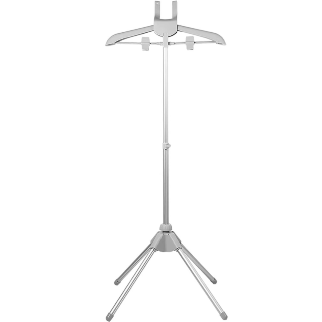 Стойка оснащена телескопической штангой с регулируемой высотой от 85 до 160 см, что позволяет настроить её под рост и рабочие условия. Прочная алюминиевая основа с пластиковыми элементами гарантирует долговечность и устойчивость даже при интенсивном использовании. Выдвижные держатели и удобные прищепки позволяют фиксировать одежду разных типов — от рубашек до верхней одежды.