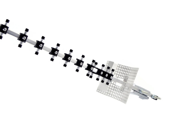 Антенна имеет 100 см длины; оснащена сеточным рефлектором; а также оборудована усилителем с излучателем в защитном кожухе и выходным разъемом F-типа.