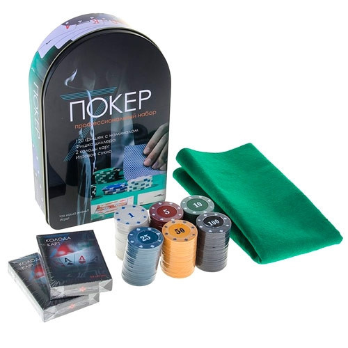 Полный набор для полноценной игры в покер. Состоит из: 2 колод карт; 120 двухсторонних фишек с номиналом и фишки дилера; а также сукна. Поставляется в металлической коробочке.