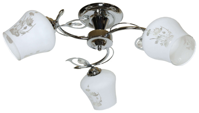 Высота (мм): 250; Ширина (мм): 540; Тип цоколя: Е27; Количество источников света: 3; Максимальная мощность люстры (Вт): 120; Вес (г): 960; Цвет основы: Хром (гальваника); Размер плафона (мм): 120; Тип крепления на потолок: Планка; Материал основы: Металл; Материал патрона: Термопластик; Материал плафона: Стекло; Количество в ящике (шт.): 4; Стиль: Классика; Площадь помещения: от 10 до 20 кв.м; Высота потолка: до 250 см;