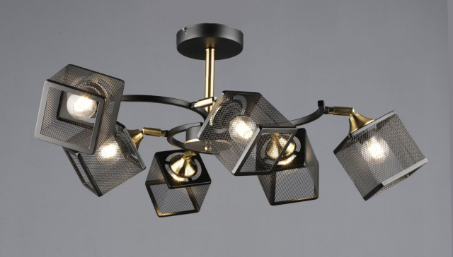 Высота (мм): 280 мм; Ширина (мм): 800 мм; Тип цоколя: Е27; Количество источников света: 6; Максимальная мощность люстры (Вт): 240; Цвет основы: Черный+бронза; Материал основы: Металл; Материал патрона: Термопластик; Материал плафона: Металл; Цвет плафона: Черный; Стиль: Модерн; Площадь помещения: от 20 до 30 кв.м; Высота потолка: до 250 см; Гарантия: 24 месяца; Тип монтажа: Монтажная планка;