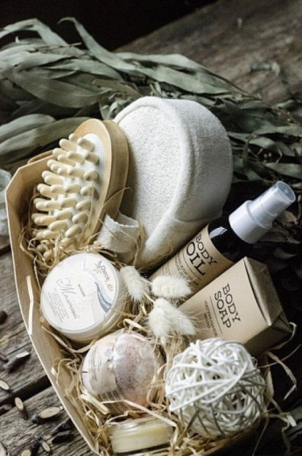 Подарочный набор для ванной или бани сделан в модном эко-стиле. Будет оригинальным и необычным подарком для девушки. В наборе так много необходимых компонентов для ухода за телом.