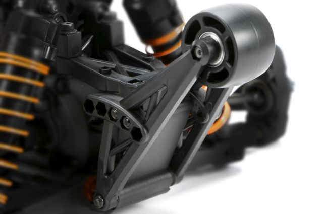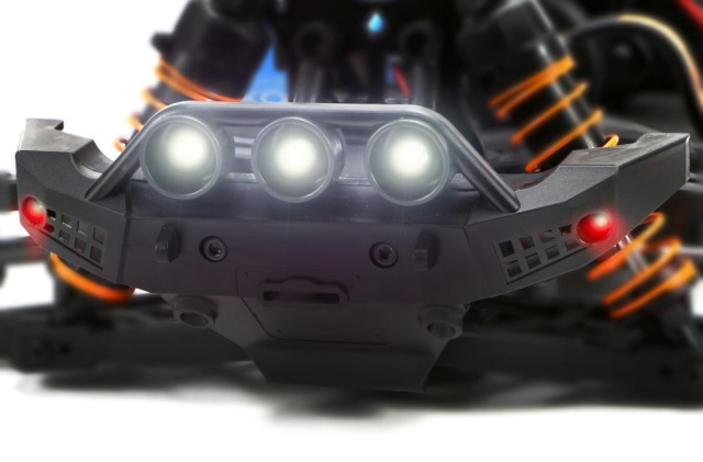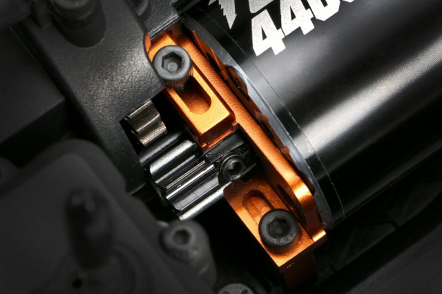 Бесколлекторный электродвигатель уже в стоке имеет размер 3655 и не требует никакого тюнинга и улучшений. Это самый мощный двигатель для моделей этого масштаба! Обороты двигателя в 1.5 раза выше среднего и составляют 4400KV, что и обеспечивает рекордно высокую скорость модели и высоту прыжков. Для надёжной работы с такой высокой мощностью инженерами было решено использовать стальные шестерни с модулем 1.0 и вал двигателя 5мм, подобно моделям в масштабе 1:8. Хексы также увеличены до 14мм и надёжно справляются даже с пиковой нагрузкой, передавая крутящий момент колёсам на максимальной тяге. Покрышки K-Factory изготовлены из мягкого состава с хорошим сцеплением и обеспечивают высокую производительность и быстрый разгон.