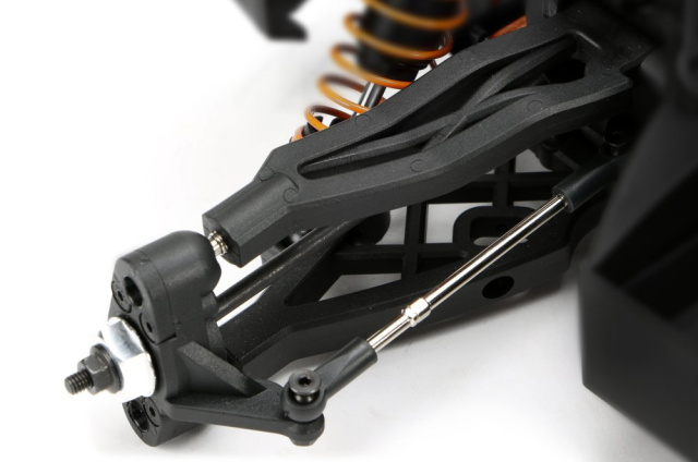 Пластиковые компоненты модели E5 выполнены из волокнистого композитного материала высокой прочности и крашеустойчивости. Передние и задние рычаги модели симметричны и взаимозаменяемы для большей практичности. Привод передних и задних колёс реализован с использованием карданных шарниров (MIP CVD), как принято во всех моделях Team Magic. Карданные шарниры обладают значительно большей надёжностью и износоустойчивостью чем обычные "косточки", преимущественно используемые в моделях масштаба 1:10. Все тяги подвески шасси E5 - регулируемые, а сервосейвер с настраиваемой жёсткостью. Подвеска у E5 максимально адаптирована для прыжков и неровных поверхностей, как и положено настоящим монстрам. Для этого установлены маслонаполненные амортизаторы увеличенного размера, а подвеска сконструирована под предельно длинный ход.