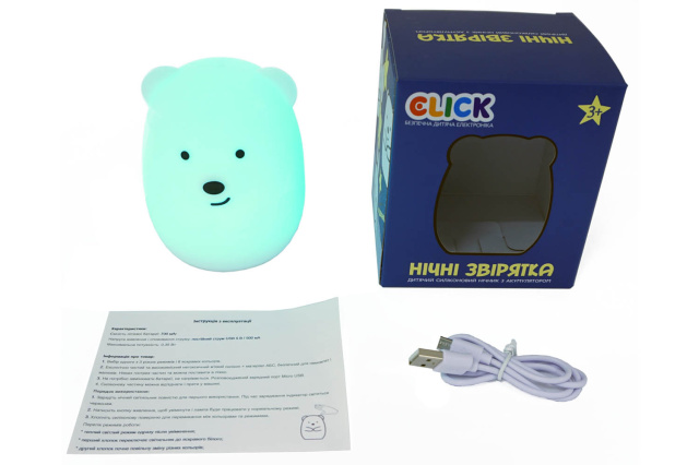 Силиконовый ночник медвежонок ТМ Click - отличный друг для детей. Дизайн в виде милого животного не оставит равнодушными ни ребёнка, ни его родителей. Нежный мягенький силиконовый плафон детского ночничка не содержит вредных веществ, травмобезопасен для ребёнка, так что его можно мять, тискать, растягивать и даже кусать! Детский ночничок очень лёгкий и совершенно не боится падений. Испачкавшийся силиконовый плафон можно легко снять с детского ночника и помыть в мыльном растворе или постирать в стиральной машинке в режиме деликатной стирки.
