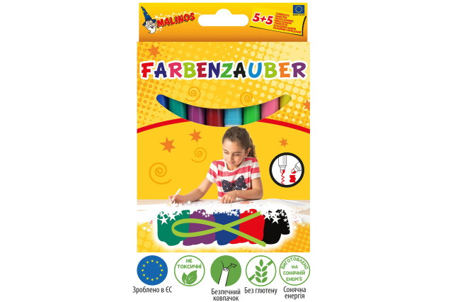 Malinos Farbenzauber - волшебные фломастеры, в которых светлые краски умеют рисовать по тёмным. Уникальные волшебные фломастеры Malinos Farbenzauber теперь можно купить и в Украине. Пять тёмных цветов легко закрашиваются пятью светлыми цветами, предоставляя бесконечные возможности для творчества. Фломастеры изготовлены из высококачественной пластмассы с кончиками из полиэстера, которые не вдавливаются. Это существенно продлевает удовольствие от рисования. Цвета не смешиваются.