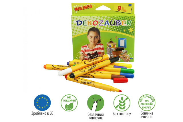 Malinos Dekozauber - фломастеры нестираемые и предназначены для декорирования разных предметов. Теперь можно купить фломастеры для декорирования MALINOS в Украине. Набор включает 8 цветных и 1 белый фломастер для декорирования различных материалов, включая металл, стекло, пластмассу, фольгу, керамику, пасхальные яйца, камни и т. д.