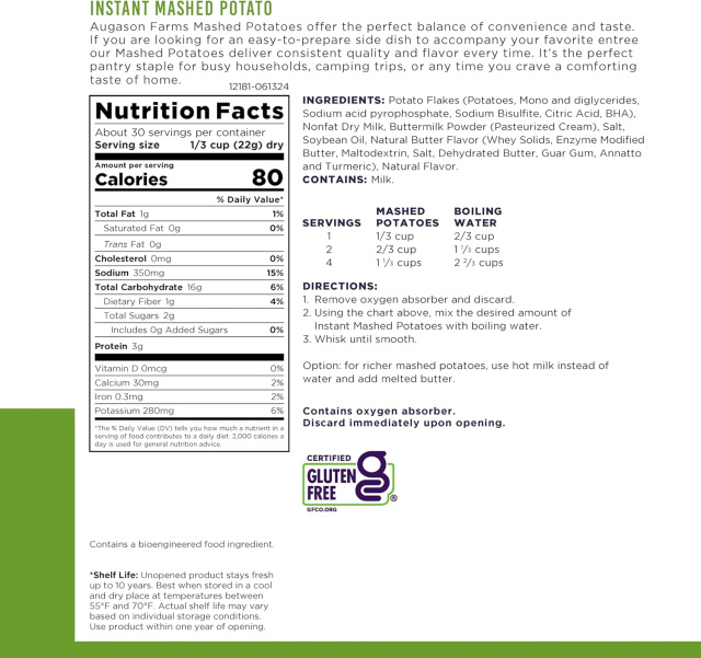 Сублімоване картопляне пюре Augason Farms - це готовий дегідрований продукт у герметичній металевій банці чистою вагою 652 грама, вміщує 30 порцій (американського стандарту) з тривалим терміном зберігання до 10 років. Картопляне пюре містить всі необхідні приправи і трохи молока.